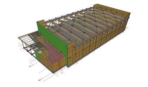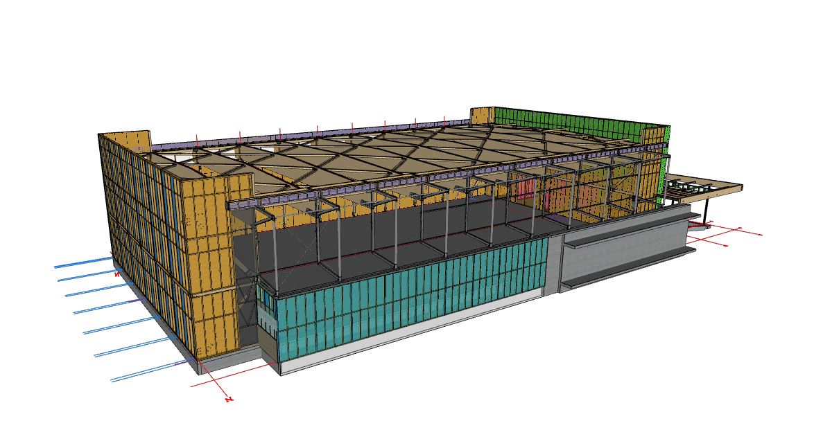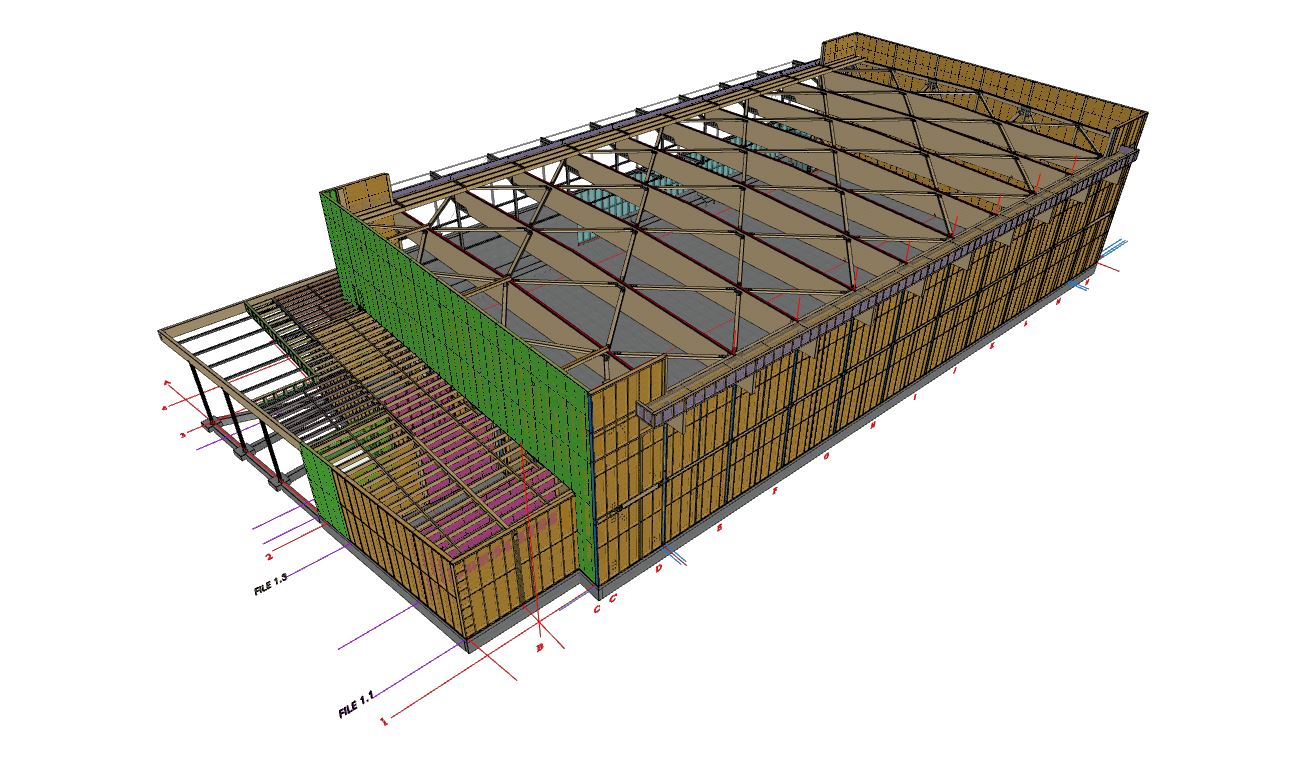 Charpente Porteuse bi pente Longue Portée sur poteaux et structure métallique.