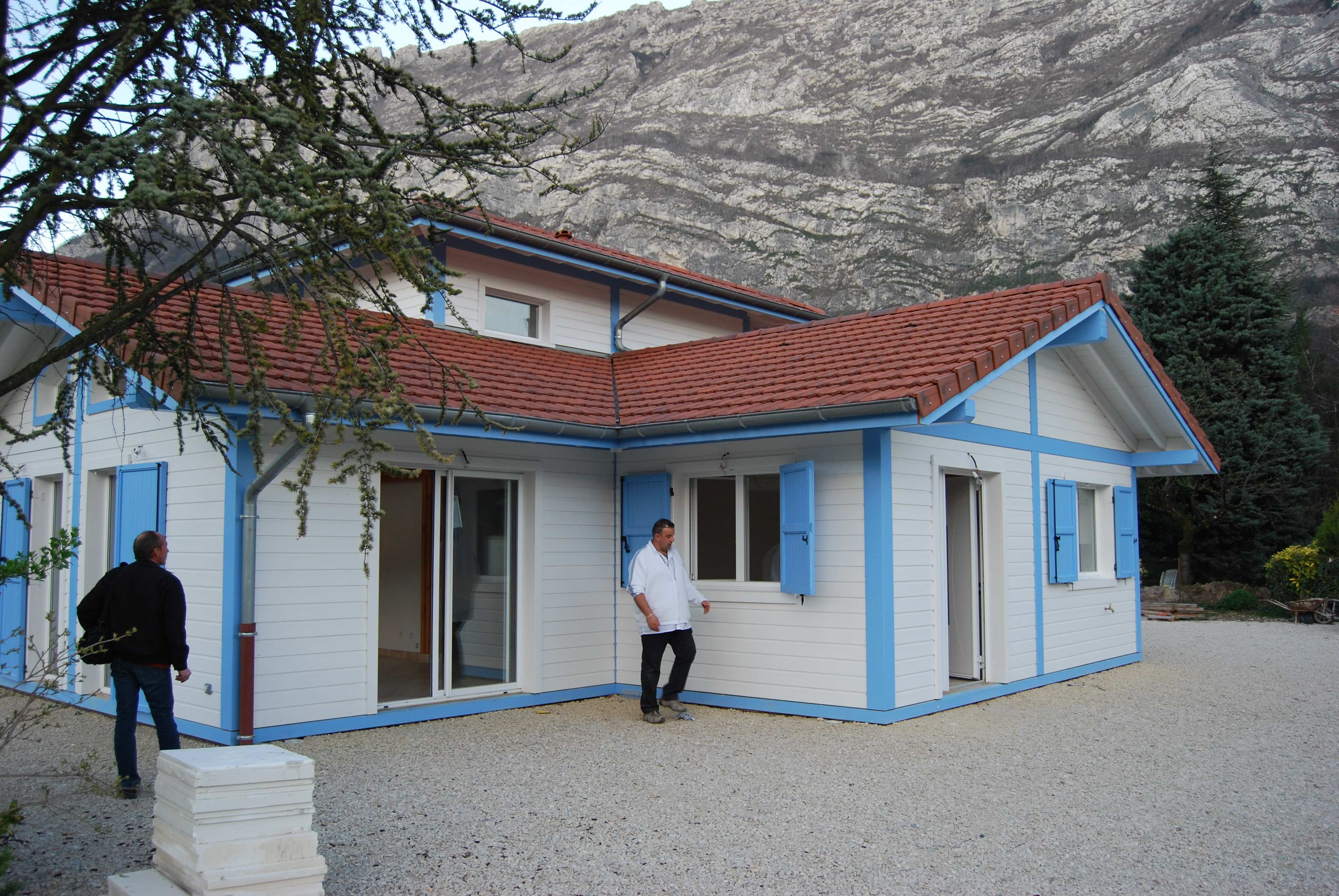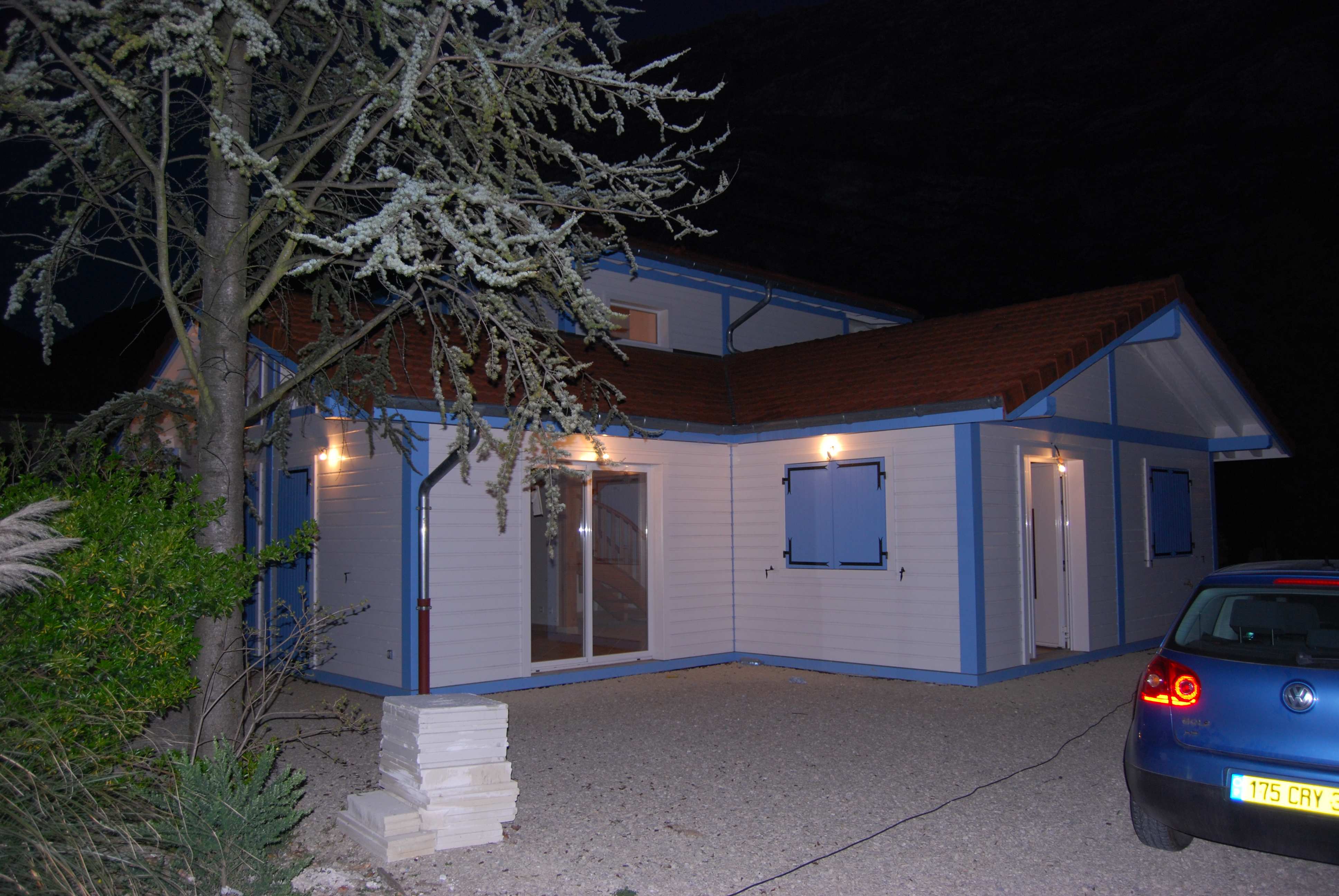 Bardage extérieur peint blanc poteaux poutres et bandeaux peints bleus volets bois traditionnels.